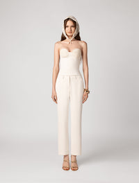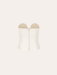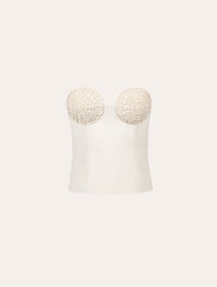 Strapless cream corset featuring structured cups embellished with handmade crochet detailing.