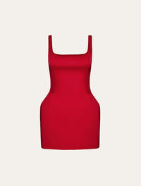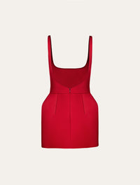 A round-neck mini dress with a sculpted silhouette that enhances the waistline through subtle hip padding and a fitted bodice, creating a refined hourglass effect. It features an open back and a clean finish in rich red.